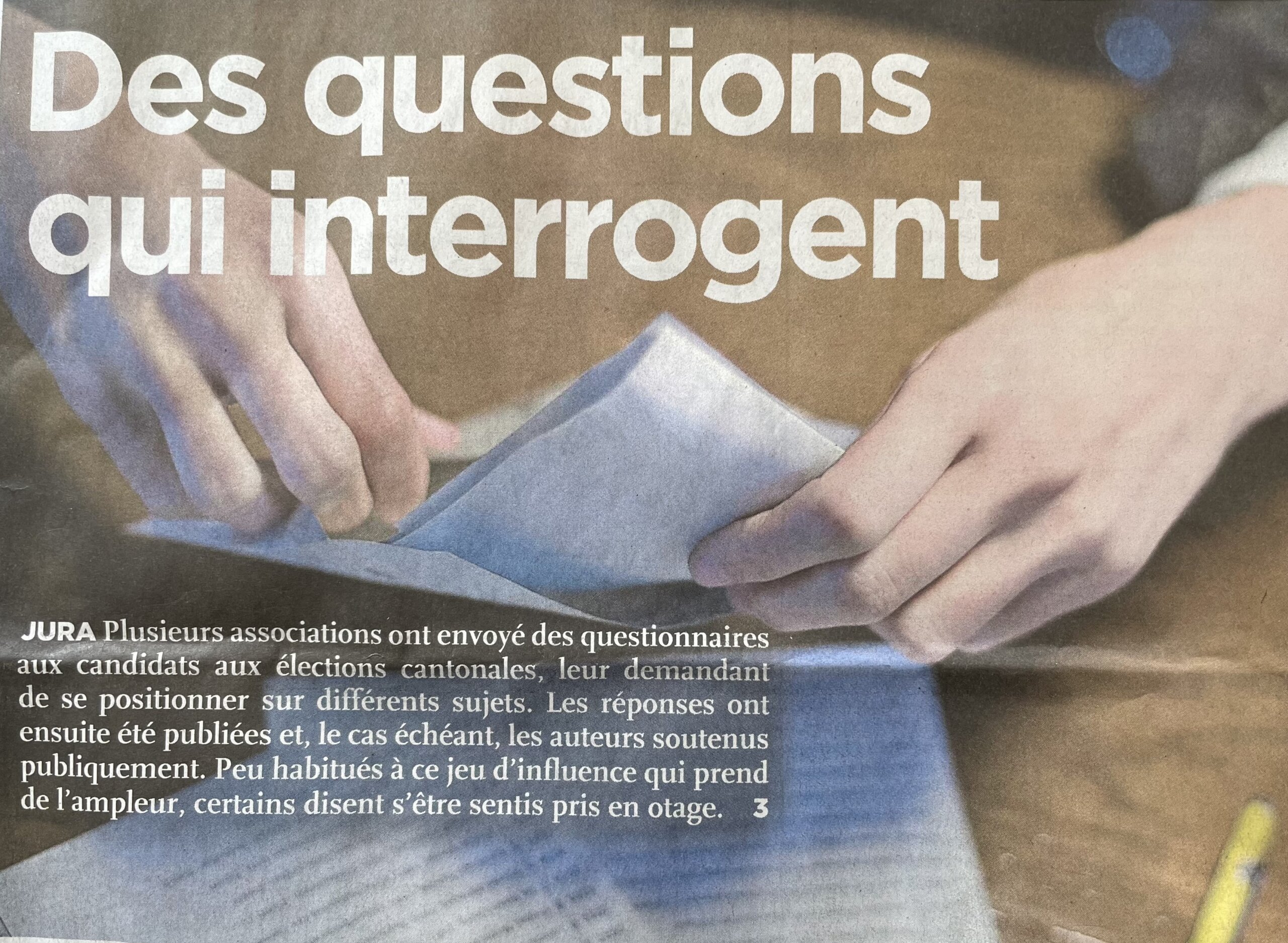 A la question « avez-vous signé l’initiative populaire « 1% pour le sport », ou allez-vous la signer ? », 101 candidats aux élections cantonales jurassiennes ont répondu par l’affirmative. Ils l’ont exprimé dans le cadre d’un questionnaire en ligne proposé par la Fédération Jurassienne du Sport (FeJuSpo).