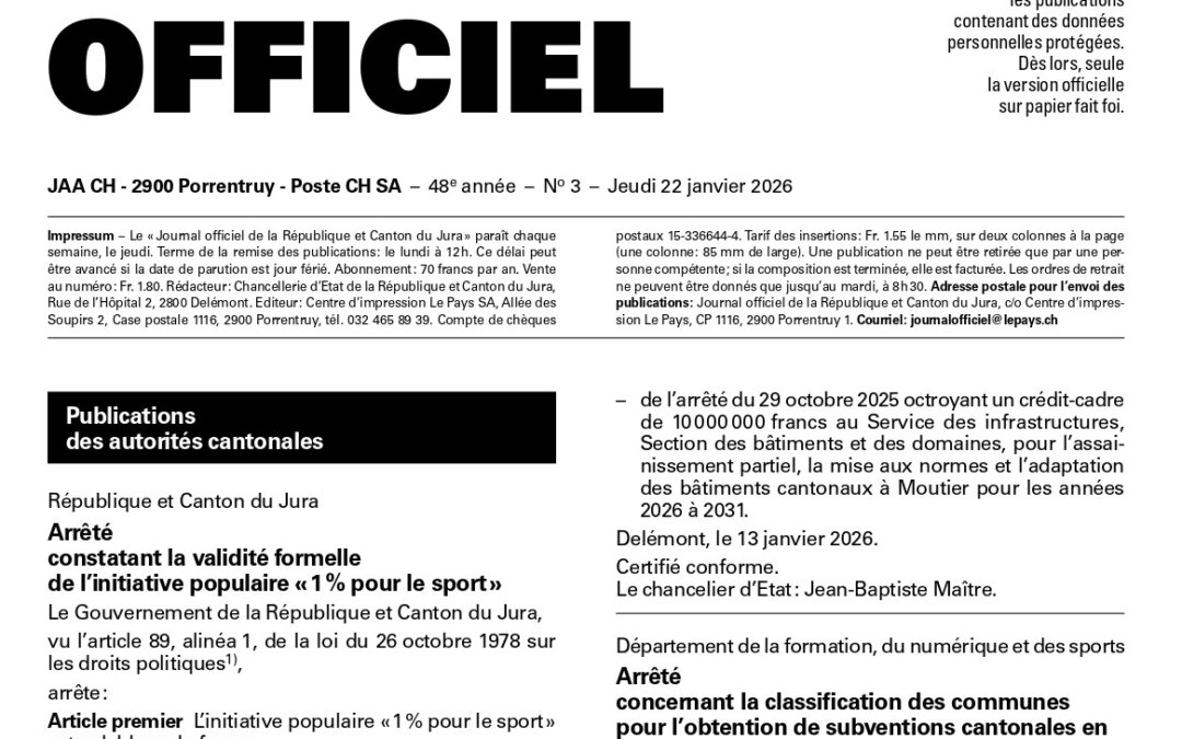 Nouvelle étape franchie par l’initiative « 1% pour le sport ». Le Journal officiel du canton du Jura du jeudi 22 janvier 2026 informe que le Gouvernement a validé l’initiative sur la forme et qu’elle sera transmise au Parlement pour qu’il statue sur le fond.