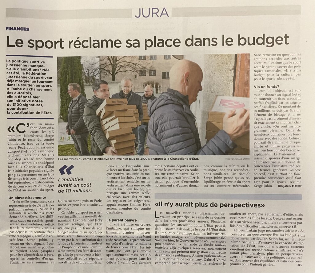 Revue de presse du 1er décembre 2025 par admin | Déc 1, 2025 | FeJuSpo, Initiative, Revue de presse | 0 commentaires Images, articles, interviews et émissions sur le dépôt de l'initiative populaire "1% pour le sport" à la Chancellerie cantonale jurassienne le vendredi 28 novembre 2025 Canal Alpha Extrait du Journal de Canal Alpha du 28 novembre 2025 RFJ Publication RFJ du 28 novembre 2025 Interview de Serge Jubin - 28 novembre 2025 par RFJ https://www.fejuspo.ch/wp-content/uploads/2026/01/FeJuSpo_depot_initiative_interview_sj_RFJ.28.11.2025.wav Quotidien Jurassien Quelques photos... ...et vidéos Poster le commentaire Annuler la réponseVotre adresse e-mail ne sera pas publiée. Les champs obligatoires sont indiqués avec *Commentaire * Nom * E-mail * Site web Enregistrer mon nom, mon e-mail et mon site dans le navigateur pour mon prochain commentaire.